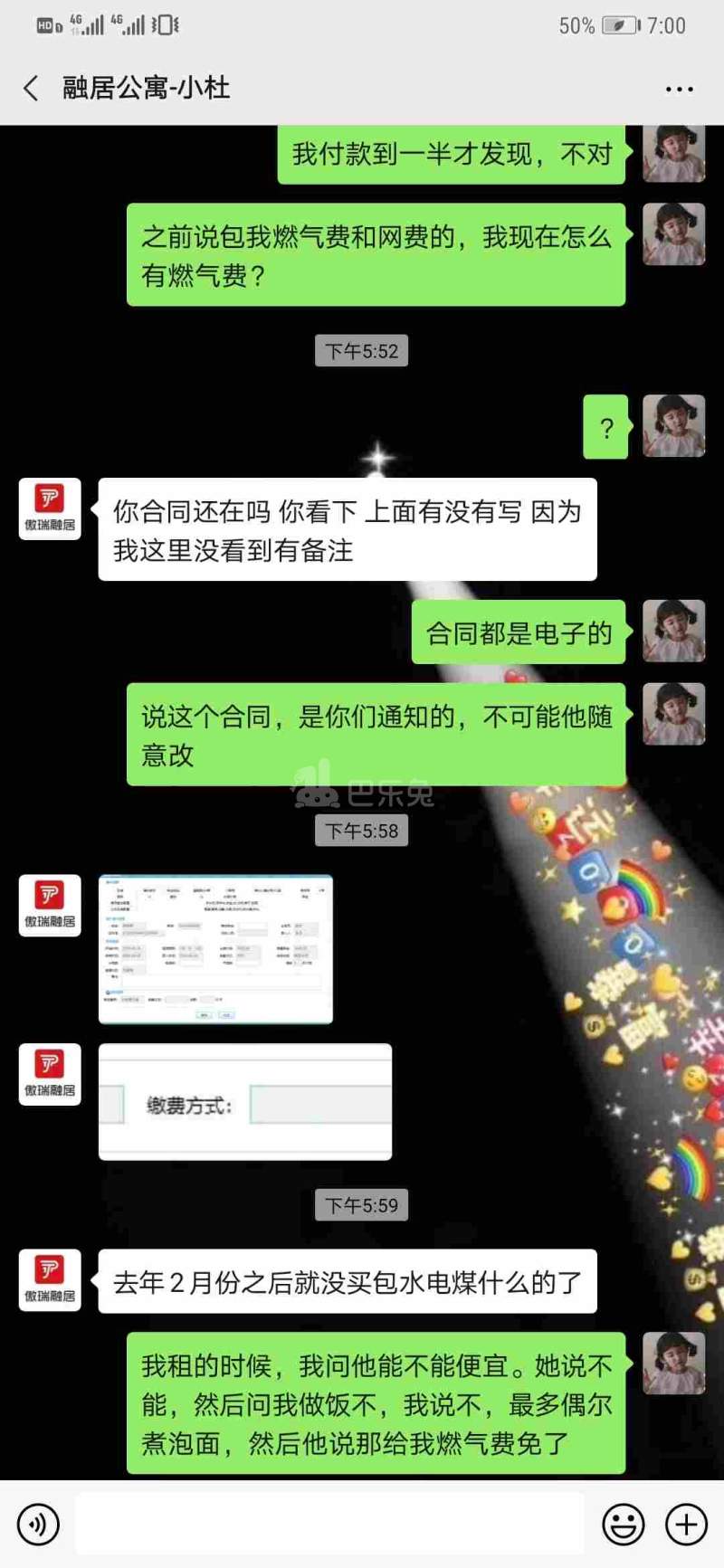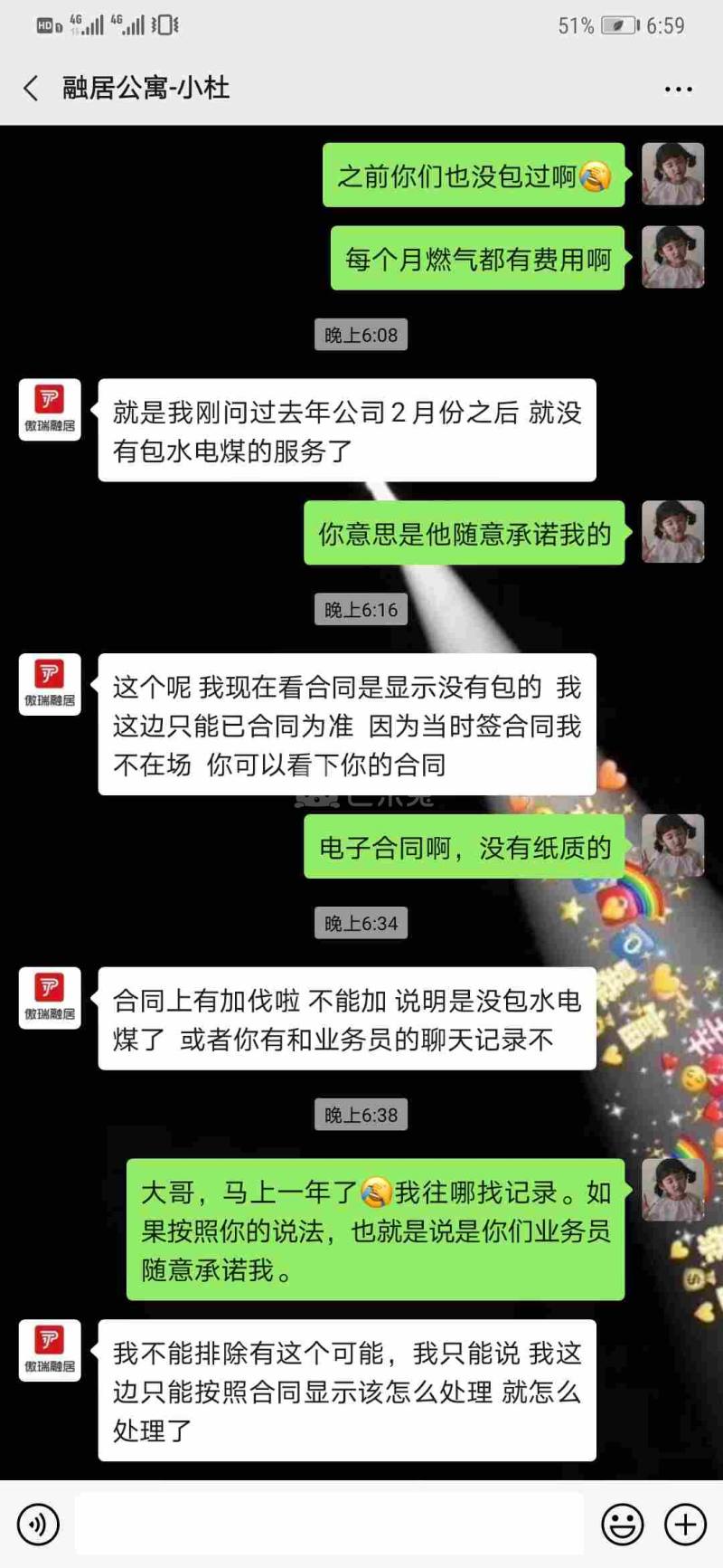 设施环境 : 住进来的时候,业务员和我说包燃气费,我在缴纳水电费的时候,发现是有燃气费,问对*,*问我要合同,合同都是电子合同,我这边肯定没办法看到,后面问他意思是不是业务员随意承诺我,*也可能。什么叫可能?